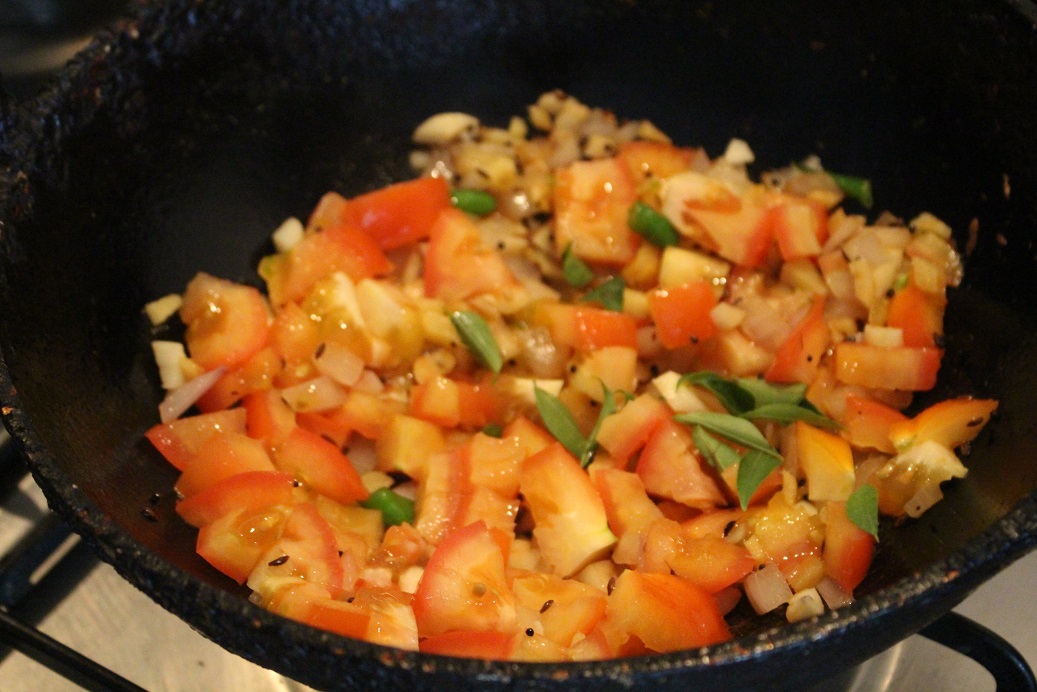 - Now add in the tomatoes and and salt and allow the tomatoes to soften and disintegrate.